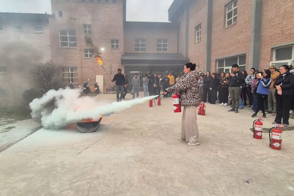 El CPEM N° 55 de Plottier fue escenario este martes de una jornada de capacitación en plan de evacuación y uso de extintores, en la que participaron los 173 integrantes del plantel educativo.